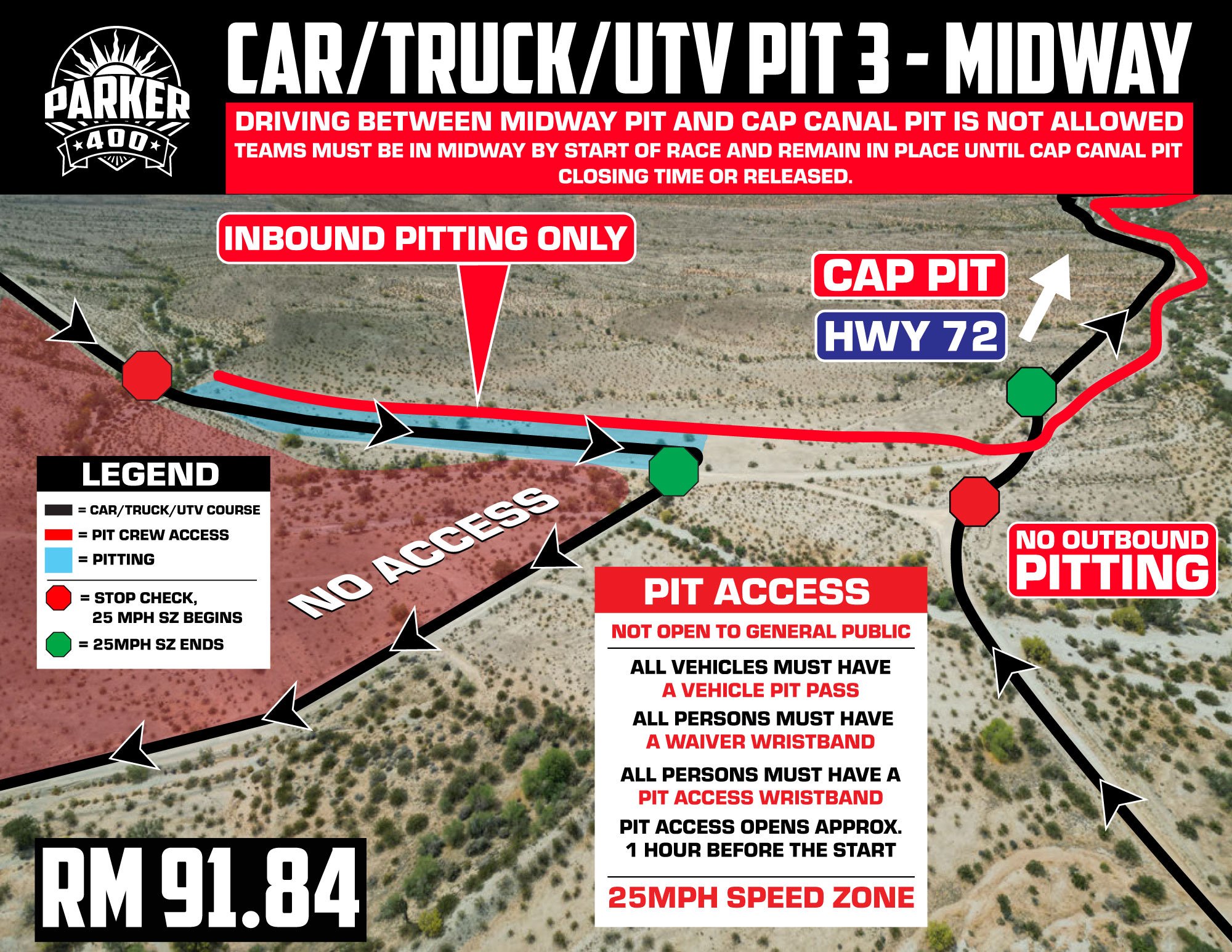 Midway Pit Notice - Midway Pit is a closed pit. This means, driving between Midway Pit and CAP Canal Pit is not allowed. You will not be escorted back and forth by medical or retrieval during the race. Once you are in Midway, you will not be allowed to leave until the CAP Canal Pit is closed. PLEASE BE PREPARED TO STAY IN THE PIT UNTIL THAT HAPPENS.